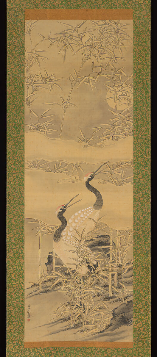 This exquisite composition by Tanomura Chikuden, one of the great Nanga painters active into the early nineteenth century, captures a pair of red-crowned cranes lifting their heads as if viewing the full moon shining though a bamboo grove. While the cranes were meticulously brushed in ink and light color, the background was rendered in atmospheric monochrome. The painter executed the bamboo and grasses in smooth lines with a fine brush while handling the rocks with expressive strokes and bold ink washes, conveying the overall effect of the tranquil evening when the moon is full but partially obscured by a stand of bamboo.