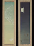 This startling diptych, capturing two aspects of the half moon—one reflected in water at dusk on the left and at midnight on the right—encapsulates a yin-yang dichotomy of light and darkness, and of a vast formation of white-feathered herons contrasted with a trio of cormorants, fishing birds of the night. The possibility of seeing either vista is of course impossible except in one’s imagination, but that is part of the allure of the work—an abstraction of idealized views of the moon and birds in flight that captures our attention like the decoration on a textile or lacquerware.