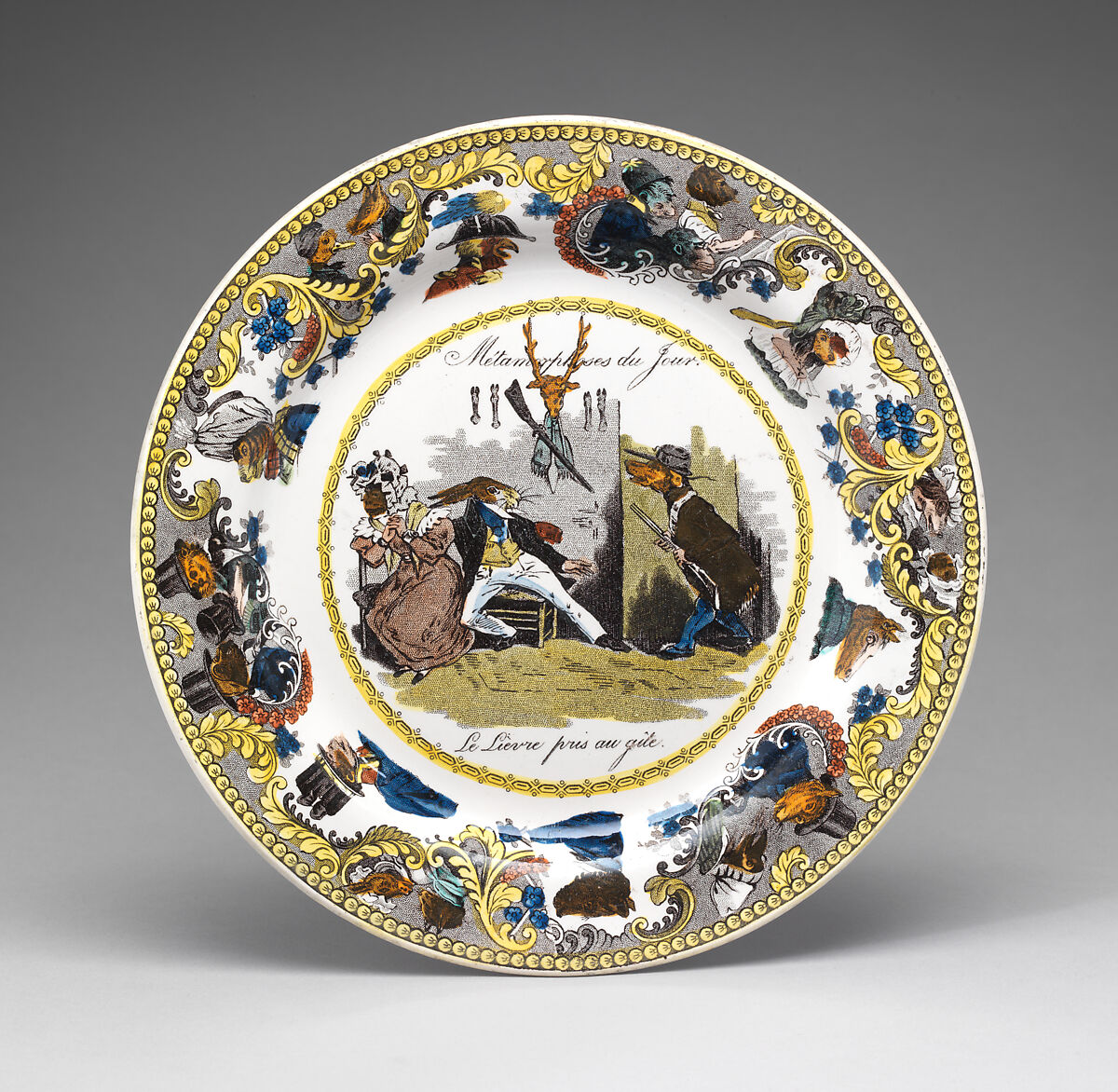 The manufacturer Creil incorporated the image from plate 3 of J.J. Grandville’s popular lithograph series, Les Métamorphoses du jour (1829), which used animal caricatures to mock and satirize French society, on this charming plate made for the middle-class market. A dandy in the guise of a hare appears to have been caught in an affair by a rustic hunting dog returning home with his rifle. Grandville was an ardent republican, and fought in the July Revolution of 1830 alongside fellow caricaturist Honoré Daumier. Caricatures mocking the government were particularly risky after 1835, when the strict censorship laws on caricature were reinstated.