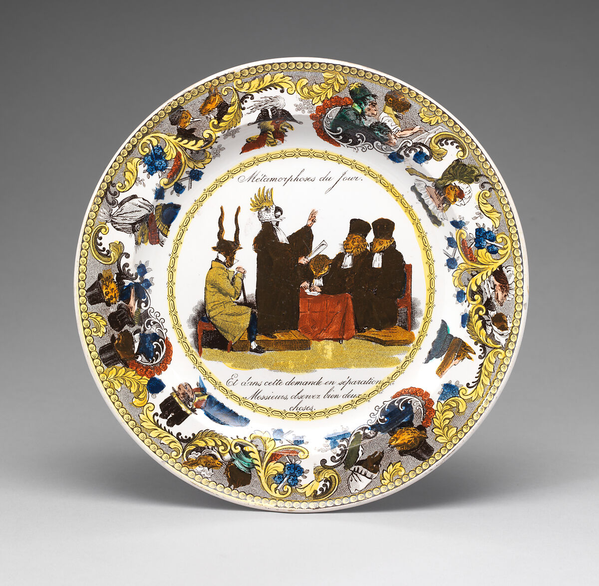 Creil’s usage of popular prints as decoration is in sharp contrast to the highly regimented and controlled forms of decoration used on porcelains made at the state-run factory of Sèvres, which specialized in diplomatic services and pieces made for a wealthy clientele. Here, Creil incorporated the image from plate 37 of Grandville’s popular lithograph series, Les Métamorphoses du jour (1829), which used animal caricatures to mock French society. France’s legal system is the target of this satire. In this image, a cockatoo lawyer pleads the case of his goat-headed client before a group of sleeping animal judges, while a feline clerk takes notes.