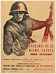 El cartel anuncia la primera convención de Amigos de la URSS, celebrada en Ciudad de México entre el 22 y el 25 de junio de 1941, en plena Segunda Guerra Mundial. Un soldado soviético con granadas en el correaje y armado con un rifle tiende la mano en un gesto de amistad y gratitud por la ayuda internacional. El título «Luchamos en el mismo frente. ¡Unidos venceremos!» refleja sus pensamientos e interpela al lector. Los cincuenta centavos que costaba la entrada al acto se destinarían a comprar medicinas para el pueblo soviético.