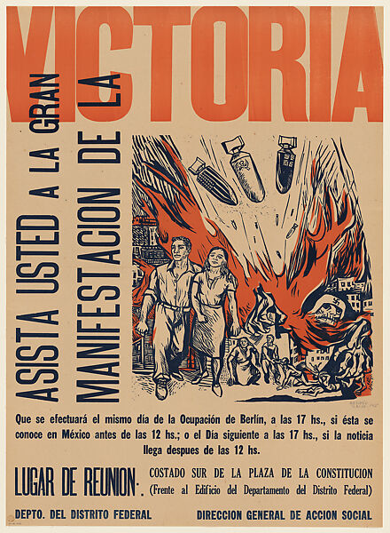 The poster issues an invitation to attend a great march celebrating the Allied victory at the end of World War II. Bombs marked as British, American, and Soviet rain down upon the Nazis, people escape the rubble, and a couple confidently marches away from the past horror toward a promising future.