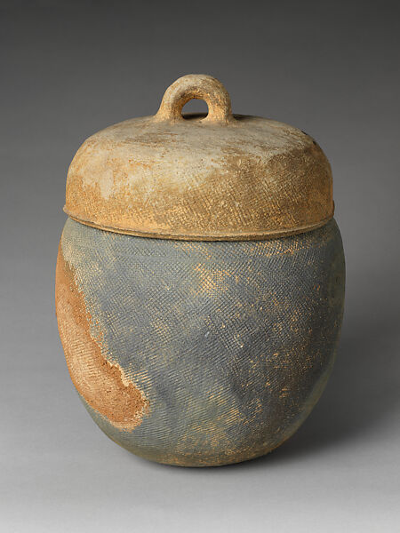This work of art is currently on loan to the museum.This jar has an impressive cover with a handle, which creates a striking silhouette. Both jar and cover feature fabric-like impressed patterns.