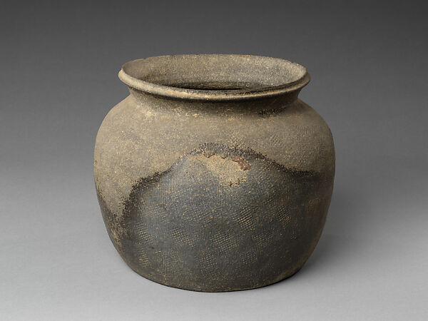 This work of art is currently on loan to the museum.This wide-mouth jar that has textured surface that suggests the use of fabric- or cord-covered paddle for shaping. It has a double rimmed lip. The color tonality could have been caused by accidental ash glaze that occurs in the firing process.
