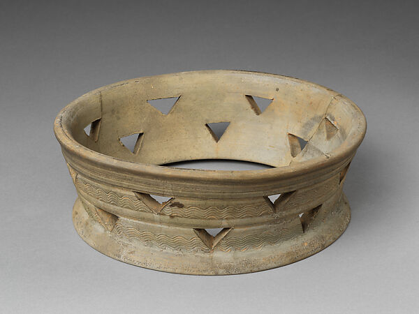 This work of art is currently on loan to the museum.Stoneware perforated stands and pedestals are prevalent in Three Kingdoms Period. Stands were made in a variety of forms and heights. The short and wide shape of this stand suggests that it would have been paired with an oversized, round-bottom vessel.