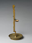Blending functionality and design, this oil lamp stand has an angular form evocative of modern design. The stepped shape of the column’s back serves as notches to hang a ring-shaped holder (missing in this example) to support a ceramic oil lamp and a circular shallow dish to either warm aromatics (if placed above the flame) or catch dripping oil from below.