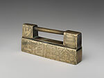 Locks meld function and design to safeguard precious goods. The highly ornamented examples here bear auspicious inscriptions that build on their protective purpose. Some reflect the desire to lead a long and happy life, while others express the owner’s wish for material riches. From left to right, they read: three lifetimes, wealth rises by itself (삼세 금왕자생); peace under heaven (천하 태평심); thousand autumns, king’s agelessness forevermore (천추 성수만세); and bright life full of blessings (일광 백복일생).