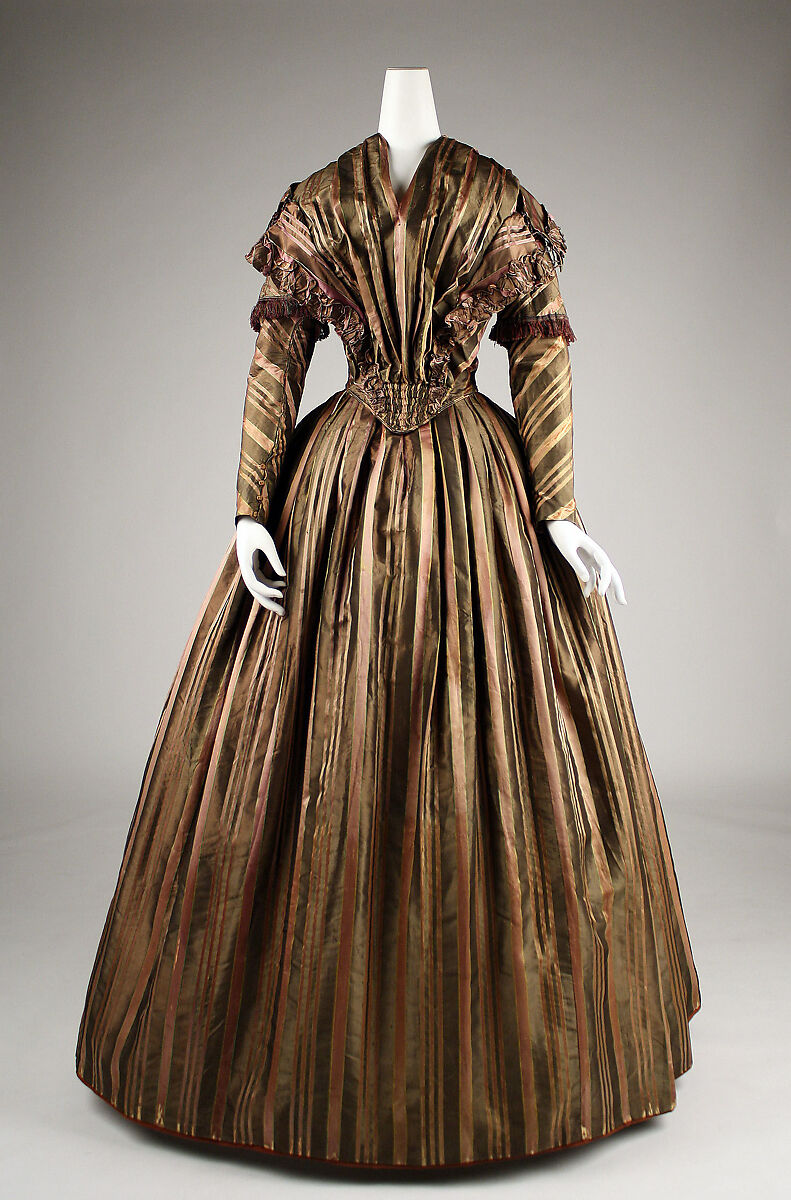 As the torso seemed to drop low in the 1840s, its attentuation was often exacerbated by pleats radiating from the pointed waist.