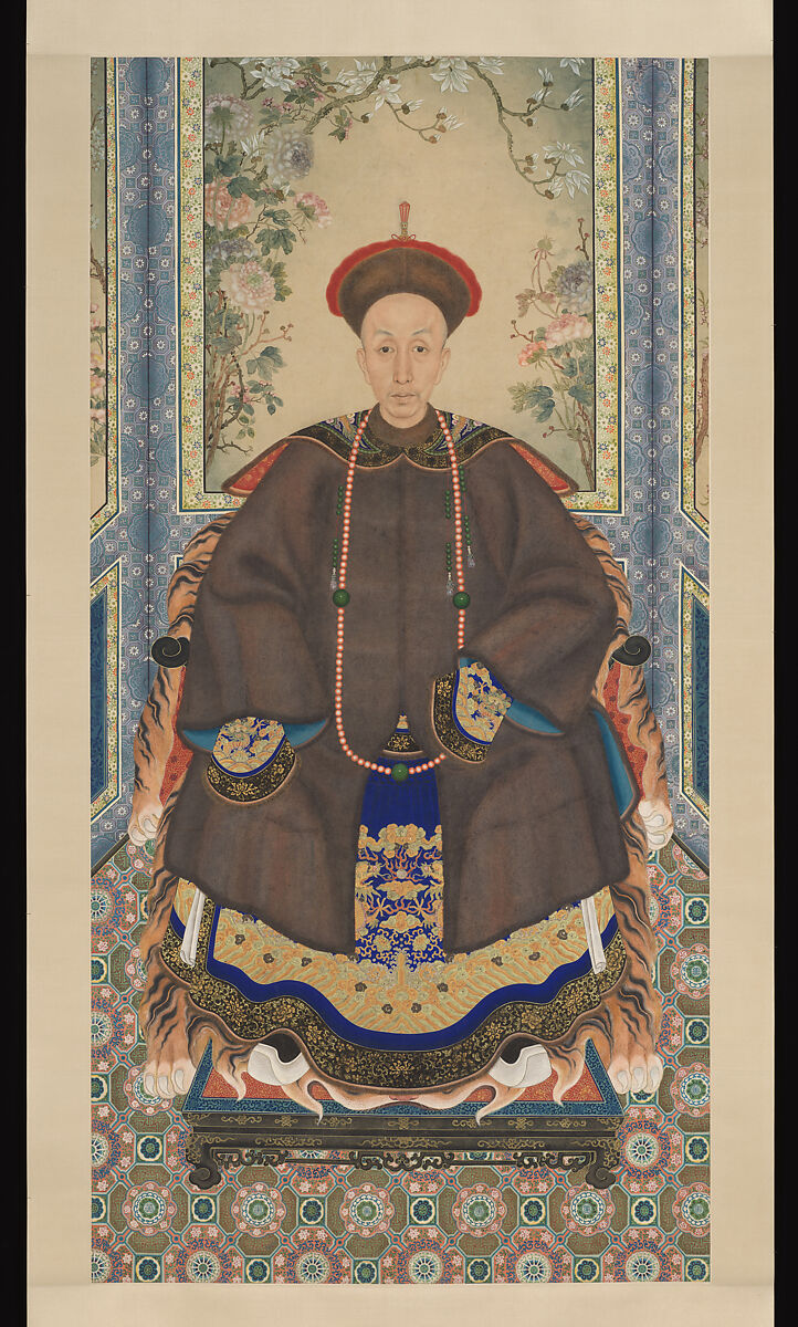 This portrait depicts a middle-aged man in court robes topped by a sumptuous fur coat. Building on both Chinese and European precedents, the artist shaded the face to suggest three-dimensional volume; the glistening white dot in the eye, suggesting moistness, is a purely European convention adopted by the artist during a time when images from abroad were becoming more widely available in China. The man sits before a screen painted with a floral rebus, or multipart visual pun: magnolia (yulan 玉蘭), crab apple (haitang 海棠), and peony (nicknamed fugui 富貴) combine to mean “fortune in the jade hall” (yutang fugui 玉堂富貴), a wish for riches and honor. With such an auspicious background, this portrait was likely made for a milestone birthday; after the death of the sitter, it could have been repurposed for veneration in the ancestral shrine.