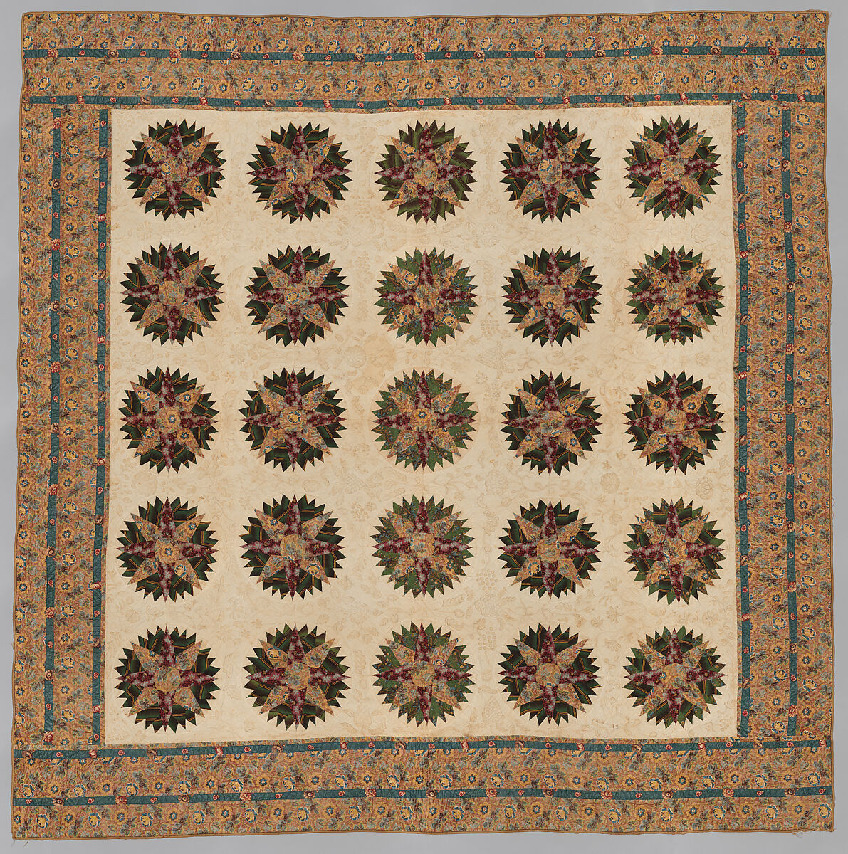 The second extraordinary fact about this quilt is that the borders and central parts of the compasses are made from a known American-printed chintz, one of the very few documented from the early period in the history of American textile manufacturing The Museum bought a piece of printed cotton chintz in 1938 (38.102) primarily because it bore a fascinating label on the back that read at center: Magueston & Co. / PREMIUM DAMASK / CHINTZ; [with pictures of two medals at top]; Left medal: AWARDED TO / Magueston & Co./ For Damask & Furniture/Chintz Prints/ 1850. Right Medal: AMERICAN INSTITUTE/ NEW YORK.