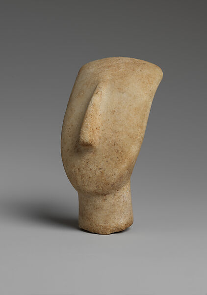 This fine-grained (maximum grain size ≈ 1mm) white marble head and part of the neck are all that survive from a figure that would have measured approximately 40.0 cm high. The head is lyre-shaped and tilted back with a broad rounded chin and a long, wedge-shaped, acquiline nose on the otherwise smooth facial plane. The top of the head shows as slightly curved from the front and flat at the back.