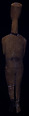 The figure is intact except for the restored left foot, and mended breaks at the neck, left knee and right ankle. This reclining female figure has a flat back and bent knees. Its backward-tilted, long, lyre-shaped head has a rounded chin and crown, and an especially long, well-centered nose carved in relief. The equally long, slender neck slightly tapers upward. It has deeply sloping, rounded shoulders and slightly, doughy arms that project slightly at the sides. An incision on either side distinguishes the upper arms from the figure’s chest. The right upper arm is disproportionately longer than the left, and three horizontal incisions define the uncharacteristically thick forearms, folded left over right, below a pair of unevenly-spaced, circular breasts carved in relief, and above a slight belly. A fine horizontal incision indicates the top of the pubic triangle. A sharp groove delineates the thighs of the legs, which then separate at the bent knees. Shallow incisions delineate the lower legs from where the top of the outsplayed feet begin, and tiny incisions indicate five toes on each foot. At the rear a fine curved incised line delineates the head from the neck. A fine vertical incision indicates the spine and upper buttocks with a curved incision delineating the lower buttocks from the legs. Finely incised horizontal lines indicates the backs of the knees and ankles.