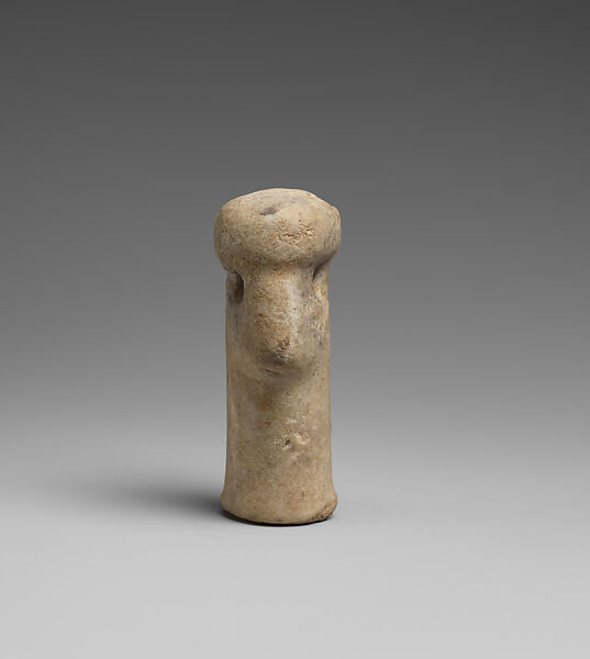 This marble head with a long cylindrical neck are is all that remain of a standing or seated figure. It features a slightly bulbous crown above bored eye sockets, perhaps for inlays, and an especially prominent, rounded nose above a lightly incised mouth. The marble surface is weathered with erosion along the grain boundaries. There are remains of brown accretions particularly thick on the lower third of the reverse and on the break surface at the bottom. There are traces of a whitish material at the holes drilled for the eyes, but no further evidence for hypothesized inlays. The head is similar to those found on Late Neolithic standing and seated figures known throughout Greece and the Balkans. (1)