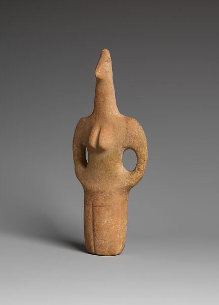 This white marble, tripartite female standing figure is complete with mended breaks and restored losses. It has a bird-like head, a long nearly conical neck, and its body is comprised of two differently worked parts: a thin upper torso and a voluminous, nearly cylindrical, lower part. Curved pointed shoulders join two curvilinear, flat arms to form a circle separated from the torso by nearly circular gaps. They seem to meet in a thickened area at the lower part of the flat belly. A deep vertical groove down the middle of the chest delineates the two oval shapes in high relief that represent breasts. The lower part of the figure is thick, ellipsoidal and rounded. A long vertical incision delineates the two legs, and a horizontal line incised across it indicates the knees. At the back, an especially rounded volume at the top of the lower thicker part describes the buttocks; a deep vertical incision there divides the legs.