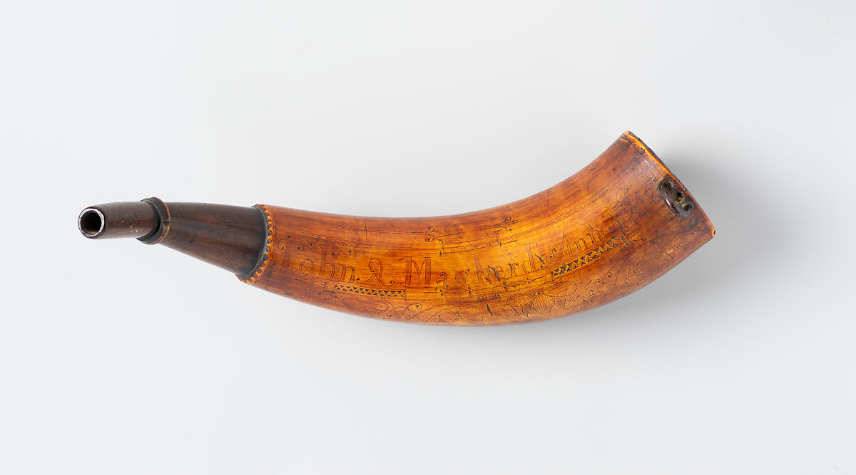 This horn is important for its ornamentation, which is both original and graceful in execution, and for its historical significance as well. The ornamental motifs and the lettering are characteristic of the horns decorated by John Bush. These works all date to the beginning of the French and Indian War (1754–63), a conflict that opposed the British and the French and their respective Indigenous allies in North America. Bush was then serving in the Massachusetts provincial militia to help the British, and stationed at Fort William Henry, a strategic stronghold on Lake George.