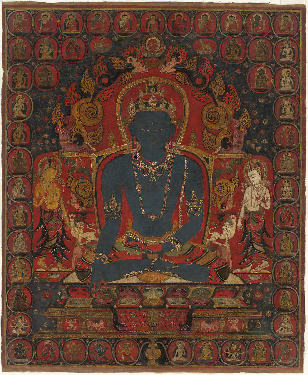 Akshobhya, the “Immovable One,” is one of the classic subjects of early Tibetan painting, a representation of one of the five Transcendent Buddhas who presided in Vajrayana Buddhism. He embodies the pure mind that distinguishes (higher) reality from (material) illusion, symbolized by the power of the vajra scepter he displays before his throne. He is understood to embody the highest expression of the power to pacify aggression and transmute it into wisdom. This painting functioned as one of a set of five such paintings, representing the five Transcendent Wisdom Buddhas, the Tathagatas, loosely translated as “those who have entered into [the truth of] highest perfection.” They were typically venerated in a mandala configuration, each assuming a specific iconographic form distinguished by directional orientation, body color and attributes. Akshobhya displays the vajra, serves as the protector of the East and is deep blue in complexion ("like the ocean"). This is one the few surviving painting from a grand tradition of monastic cloth painting practiced in Tibet in the 13th through to the early 14th century. It was collected by the Italian Tibetologist Giuseppe Tucci on one of his eight research expeditions undertaken in Tibet between 1928 and 1948.