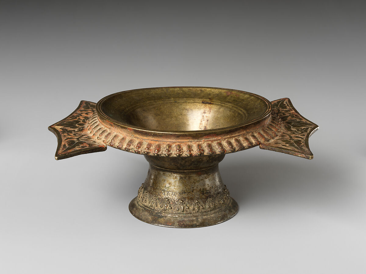 This ritual vessel contained oil used to mark a mandala on the floor to evoke the goddess Arya Tara/Lakshmi during the Tihar festival of lights. This family ritual was done to bring prosperity to a child. A Bakunda set of vessels would have included a second container for cooked rice. According to modern practice, family members will give new clothing, and after the mother has conducted this ritual, the father will give the child money. The handles are decorated with floral patterns, and around the foot is an inscription that provides the date of this initiation ritual.