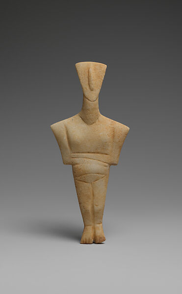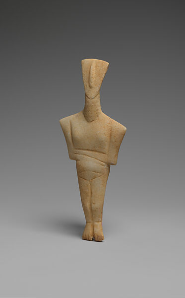 The figure has a triangular head with angled crown at the top, a rounded chin, and a broad long vertical nose that is the only sculptural feature of the face. The head rests on a tall neck set off from the chest by a curved groove at the front and two short angular grooves at the back that join at the spine. The shoulders have a pronounced slope and the arms are folded over the abdomen, the left above the right. The figure has high, widely spaced small breasts, a slightly bulging belly and a pronounced pubic area defined by three grooves. On the front, a long vertical groove divides the legs which have slightly bent knees and downturned feet below offset by short horizontal grooves. The toes are defined by short vertical grooves. On the back, a long vertical groove defines the spine and continues between the buttocks and the legs, widening at the feet. In profile, the figure is nearly straight and essentially the same width except for the slight bend in the knees, the rounded buttocks and belly and the tapering head and feet.