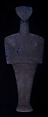 The piece is intact except for a join in the upper neck and a few small modern fills which have been repaired. There are encrustations covering the entire figure, some of which have been removed, especially in the area of the neck and lower back legs. There is no evidence of pigment or paint "ghosts." The head is spade shaped with a prominent nose, the mouth indicated by a shallow groove. The head rests on a tall, massive neck, which is decorated with a series of grooves – six on the front and eight on the back. The broad carefully sloped shoulders come to right corners that become the narrow arms which are bent at the elbows and rest the left upon the right to frame the upper body. Small, rounded breasts, the left slightly smaller than the right, are spread far apart on the otherwise flat chest. Beneath the arms, the belly consists of three horizontal bands that may indicate post-partum folds of flesh. A prominent pubic triangle and genitals are defined by three grooves, the central one continuing to create the division between the legs down to splayed feet. On the back, a single vertical line is used to indicate the spine, the cleft between the buttocks and the division of the legs to the feet. The lower engraved line on the back and on the front are not straight but free form in contrast to the highly organized and carefully executed schema of the rest of the figure.