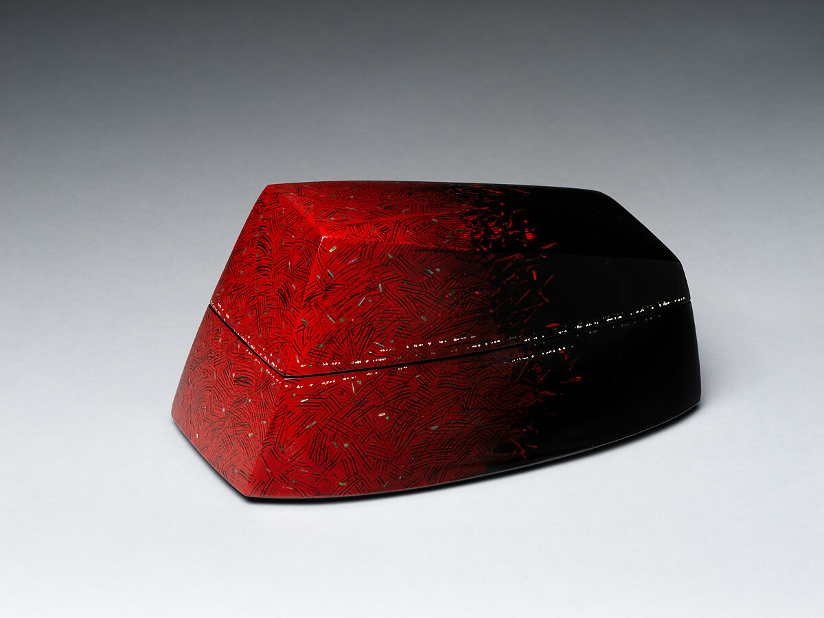 Kim Seol draws from various traditional methods to create new techniques, such as the blending and layering of red and black lacquer or the addition of tofu to texture the resin. With this box she creates a complex asymmetrical shape with no identical surfaces and complicates the ornamentation by combining incising and inlay techniques. She contrasts the bright white opacity of the inlaid quail eggshell with the pearly luster of the mother-of-pearl.