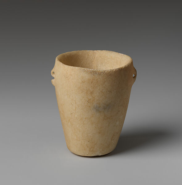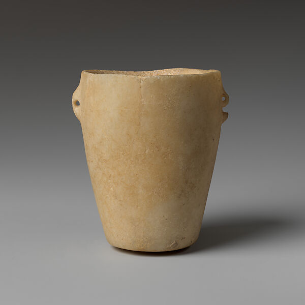 This truncated, rather uneven, conical beaker was carved from a small block of whitish marble. Its thin walls taper outward from a flat thick base with everted edges and, at the widest part of the body, taper slightly inward toward a rounded rim. The diametrically protruding lug handles on either side have perforations from which the vessel would have been suspended. On one side there is a single vertical, perforated lug that has a wide rounded shape resembling lugs on pottery of the same period. On the other side there are two smaller lugs, one above the other and separated by a deep groove. The upper of these is vertical, rounded and perforated; the lower is horizontal with a vertical deep, funnel-shaped, unperforated cavity in the center. Most likely these two lugs originally comprised a single, symmetrical, vertical lug that was broken at the time of manufacture. Although repairs of lugs are noted on other vessels of this type, the reworking of the lower horizontal lug with no perforation seems extremely rare.