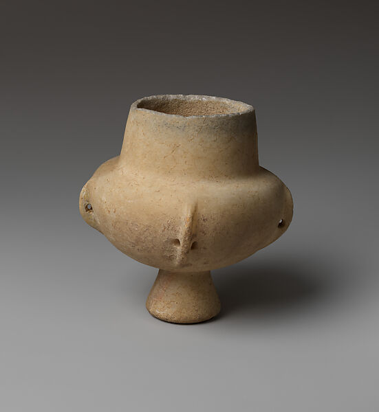 This is a nearly intact collared jar made from white marble with blueish striations with a pedestal foot and four crescent perforated lugs. It has a cylindrical, tampering neck, a wide mouth with a vertical rounded rim on a rather hemispherical body with flat shoulders, that stand on a compact conical foot. The gray-bluish striations of the marble in the area of the rim were used to create a visual effect. The conical foot at its bottom has a small concave hollow and wide standing ring-like edges. The crescent-shaped lugs are carved diametrically, protruding considerably, and pierced, cutting parts of body walls; they are not always placed vertically but they are in rather oblique angles. One is missing and has been restored. The interior has been carved in U shape. Tool marks may be seen there, which have been smoothened, suggesting the use of a bow drill. The outer surfaces are smoothened. Its large size is within the range of this vessel type as discussed by Pat Getz–Gentle.(1) Its closest parallel comes from the Panagia cemetery on Paros.(2) In the Stern Collection of Cycladic Art, L.2022.38.38, 36, and 72 are of similar size.