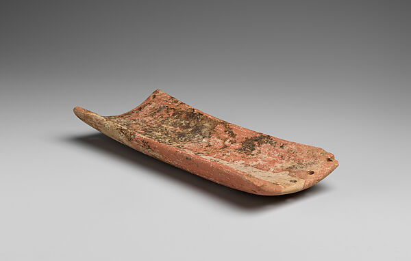 This palette, carved from a light red and buff banded tuff, a type of volcanic rock, is nearly intact except for minor chips at three of the four end points. The long sides curve up creating a trough shape and five evenly spaced holes are drilled into each of the short sides. These holes would have been used for suspension or affixing it to something. Unlike other perforated palettes, this one is unique for having so many drilled holes.