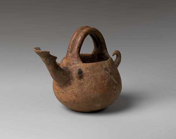 This terracotta spouted vessel is complete with only minor losses at three of the four horn-shaped lugs and repairs at the top and base of the spout and at the base of the handle near the spout. It consists of a deep rounded body with a doubled basket handle at the rim, and a long, upward curved spout with a wide flaring rim. There are four horn-like lugs at the upper part of the body. It is made of a grayish clay with a lightly burnished, reddish-slipped exterior. This vessel closely resembles the pottery of Yortan Class B from the Troad, in Turkey.(1)