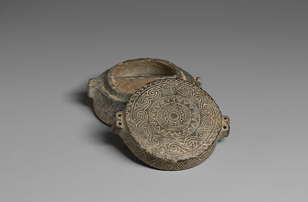 Two concentric bands of hatched and plain triangles separated by three concentric lines decorated the exterior body. Another band of hatched and plain triangles embellishes the vertical walls of the lid. On the flat top of the lid are concentric bands of various decorations: a plain circle at center, followed by one with oblique lines, another with hatched and plain triangles, a running double spiral and, on the edge, a zigzag pattern. Kaolin, a pure white clay, may have been used to fill the incisions and accentuate the designs.