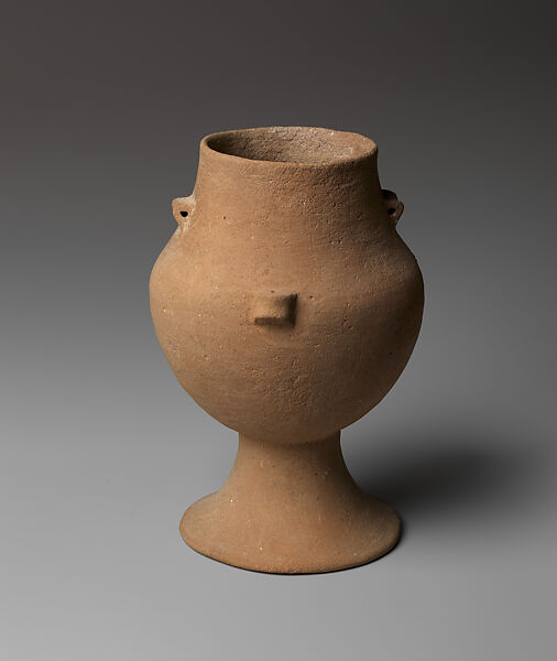 This beautifully formed, handmade terracotta jar is intact except for minor chips and abrasions at the rim. Its hemispherical body, out splayed pedestalled base and broad conical collar with an everted rim derives from the Early Cycladic I footed collared jar, or kandila. It has two vertical pierced lugs diametrically placed at the top of the shoulder and two horizontal pierced lugs placed opposite each other midway up the inward sloping neck.