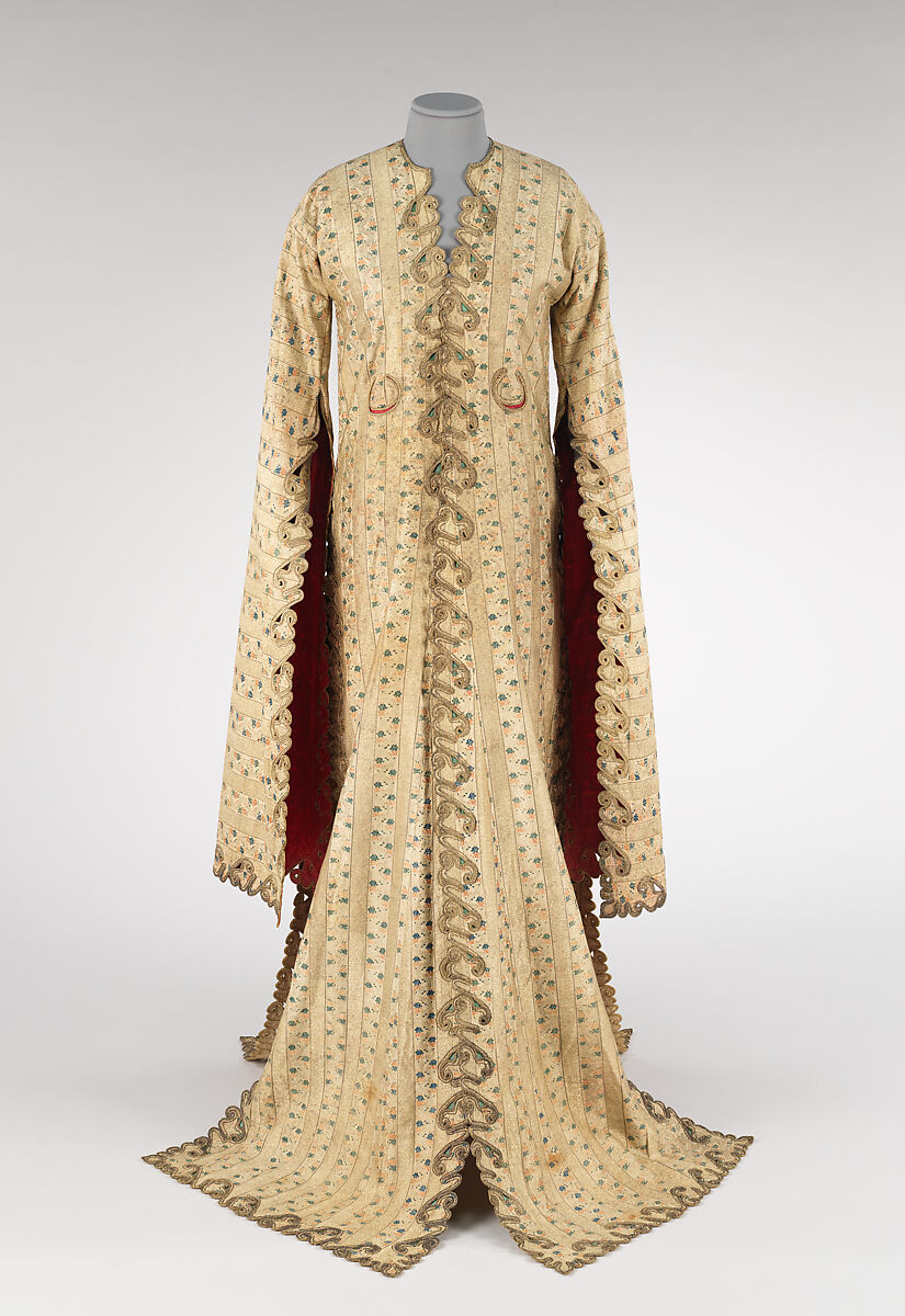 This entari, or robe, was a very fashionable garment in its time. The key element in the dress of an Ottoman woman, worn with a chemise, called gömlek in Turkish, and baggy trousers, or şalvar, the entari was open down the front with long sleeves and, in this case, trailing skirts. The exaggerated length of the skirts and sleeves signal the interest in current fashions on the part of the garment’s owner. Another fashionable detail is the pair of small, circular pockets in the bodice of the garment, known as watch pockets and intended to display the small pocket watches which became status items when they began to be imported into the Ottoman Empire.