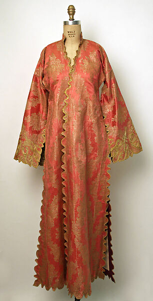 Made of a coral-colored silk satin with a gold brocaded design of floral garlands and bouquets, this entari, the main element of women’s dress in the Ottoman Empire, would have been worn by a wealthy Ottoman woman with a gömlek, or chemise, and şalvar or baggy trousers. A belt or sash, slippers, jewelry, and an ornamented head dress would have completed the outfit. The garment’s structure is typical, with a small stand-up collar, high slits on each side and long sleeves open to the elbow. Nine buttons and loops at the bodice would have been used to hold the robe closed. The front, skirt, and sleeve edges are finished with a scalloped design, edged in gold braid. The sleeve ends have an elaborate cut out design and are lined with a flowered striped silk associated with Bursa, an important silk production center in the Ottoman Empire. A maroon silk and cotton blend woven from pink silk wefts and dark blue cotton (?) warps is used to line the skirt edges and front opening. Purchased in Nice in about 1930, it is possible that the entari was bought there from members of the Ottoman dynasty, many of whom fled to Nice when they were exiled in 1924 following the establishment of the Republic of Turkey in 1923.