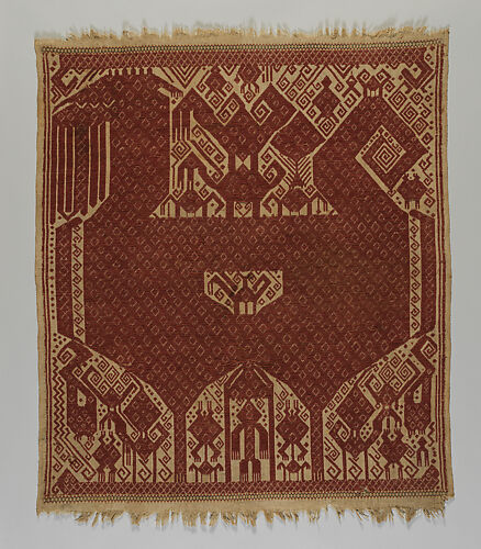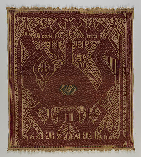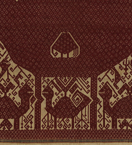 This is an exceptional ceremonial banner (palepai) from Semangka Bay in Lampung, Sumatra, Indonesia. Woven with cotton and metallic wrapped yarns in the supplementary weft technique this is a particularly rare and exceptional example. Also known as ‘ship’s cloths’ due to their iconography which often depict large ships and reflects the vibrant cosmopolitanism of the area, this palepai is a particularly rare and exceptional example featuring a single vessel in blue with a complex array of iconography typical of the genre, here picked out in red thread and other contrasting colors to highlight the designs. These include a boldly graphic area of densely formed interlocking blocks of scrolling – a feature of the left of the textile that is echoed at either side of the prow and stern of the central vessel – and emulates the dynamic rise and fall of the waves as the vessel moves through the water as well as a more literal representation of the long oars which propel the vessel through the sea. Human figures of varying dimensions populate the deck standing amidst fantastical creatures featured with mounted riders that are repeated along the upper and lower borders of the textile itself as a framing device. A remarkable level of patterning embellishes the design of the vessel itself at stern and prow creating a dynamic and highly animated narrative scene.