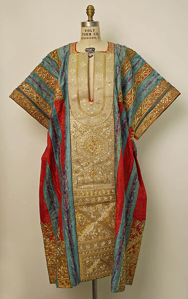 This opulent Tunisian marriage tunic, known as a jebba, is heavily embroidered with symbols which promote fertility and good luck. Bridal costumes are often decorated with symbols intended to protect the bride, because she is seen as especially vulnerable during this pivotal moment in her life. This tunic features stylized khamsa or "hand of Fatima" motifs, which are meant to protect the bride from the stare of those who are jealous of her good fortune.