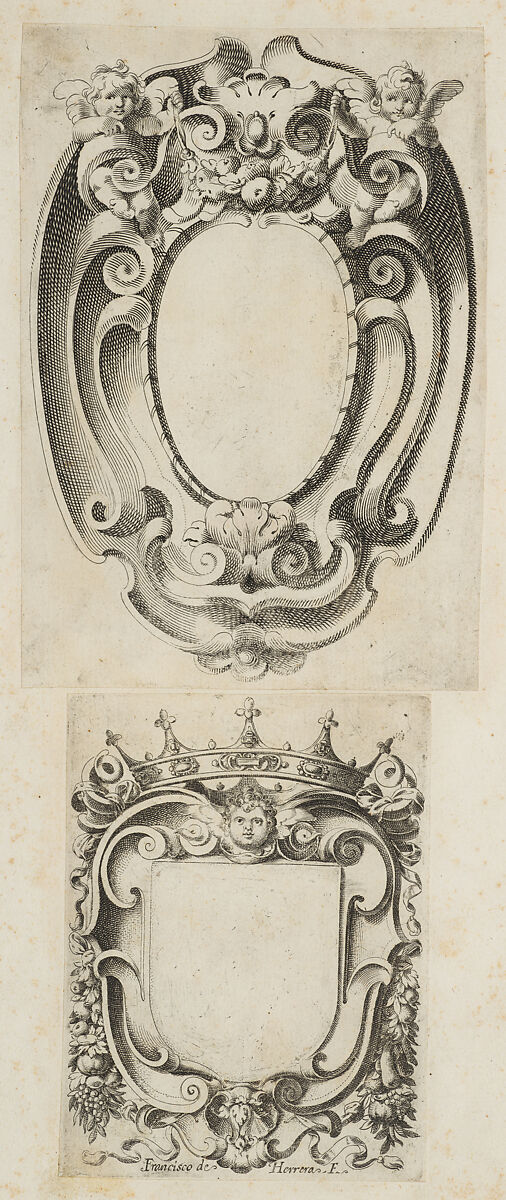 Fourteen prints with cartouche designs by Francesco Herrera the Younger, pasted into the album, two to a page. One of the prints on page 50 of the album stands out from the group. It shows a design for a cartouche with a crown, and is further decorated with a cherub and two hanging festoons. The central compartment is shaped for the inclusion of a coat of arms, but left blank. The other thirteen prints contain larger cartouches that differ in form and execution. The style of engraving is loser, and in certain areas outlines are fully omitted or only executed with a stylus. The prints are all cut within the plate marks at various sizes, which makes it difficult to tell whether they all derive from one and the same series. Only one set of 12 prints is known (documented in SKB Berlin 1939), but the number of plates in this album suggests that Herrera issued more than the single set. Herrera likely made the prints while in Italy. That Herrera's stay in Rome coincided with the production of the prints appears to be confirmed by their use as frontispieces in several manuscripts kept in the Santa Maria in Monserrato degli Spagnoli in Rome. Their presence in this album may be taken as further evidence of this sequence of events. For Herrera's prints, see Navarrete Prieto 2023.