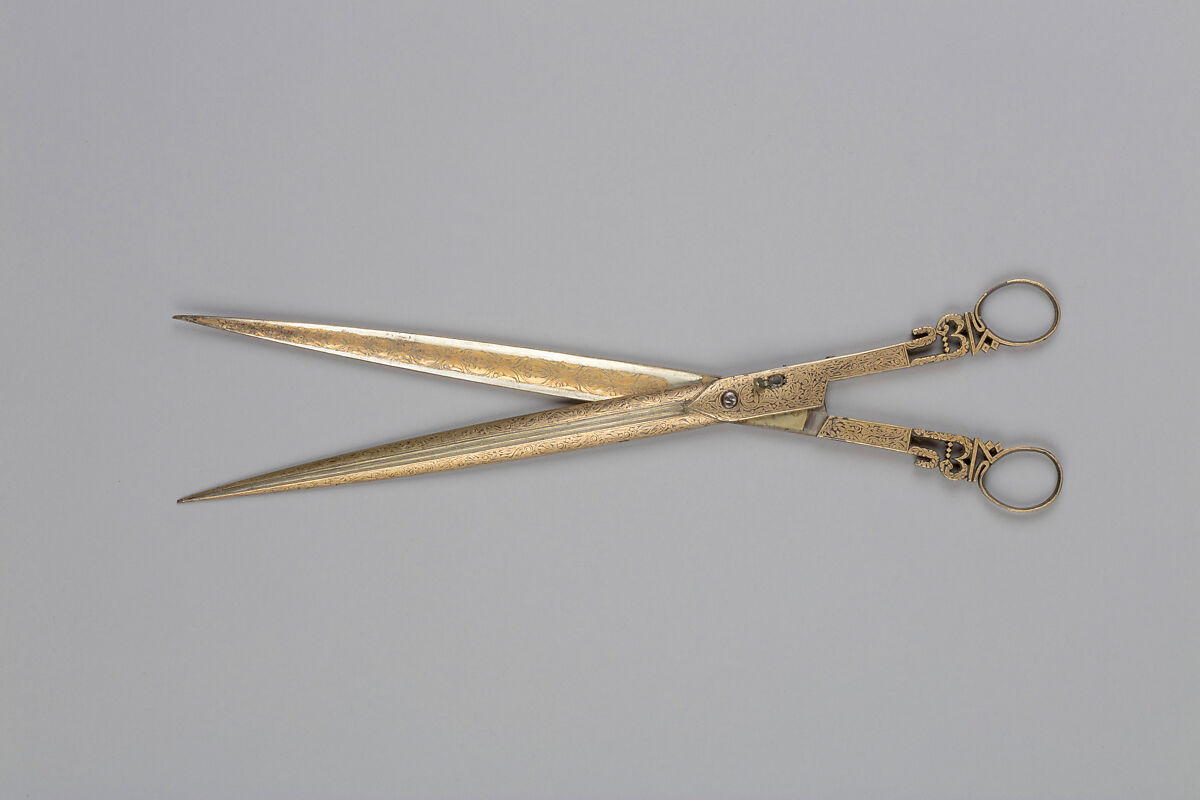 Although small, the elongated shape gives these scissors an elegant appeal. Almost the entire surface, including the inside of the thin blades is finely decorated in floral patterning, exemplifying the intricate craftsmanship of gold damascene metalworking during the late Ottoman period. The artist left his mark by inscribing his name "Sheref" in a small drop-shaped cartouche, hardly visible to the eye. Among the originalities of this example are the handles rendered as an open-work calligraphy. "Ya Fattāh” (Oh [God] the Opener!), referring to one of the ninety-nine beautiful names of God (al-Asmā al-Husnā), is written in elegant thuluth mirror script. Another rare feature is a lock on one side, enabling to lock and unlock the blades. Scissors like this one were considered a catchy "must-have" tool by the Ottoman elite. They were used by calligraphers, viziers, treasurers, chief-secretaries, rulers, and others whose profession related to writing at or nearby the Ottoman palace, as well as by other members of the Ottoman elite. Sometimes such scissors have a dedication which attests that they were fitting gifts or served as recognition for the work and services of a dedicated individual.
