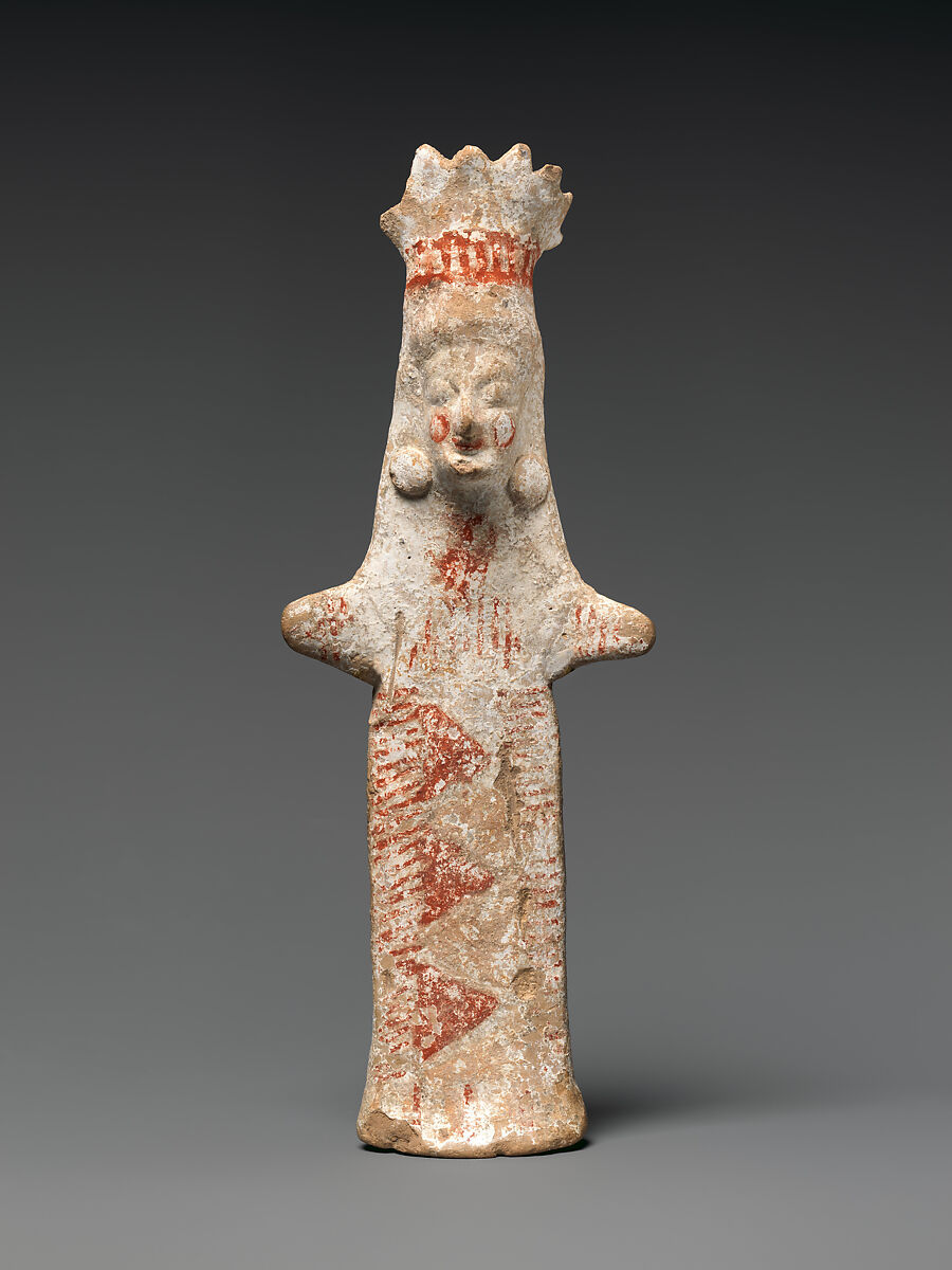 Colorful details painted on a white slip accentuate the elaborate makeup, accessories, and drapery adorning this female figure. Yellow ocher applied to the headdress, earrings, and garment evokes gold, and red ocher painted on her neck probably depicts a necklace of pomegranates, a symbol of death and rebirth. The headdress with rays suggests the woman is a goddess, perhaps Persephone, queen of the Underworld. Discovered primarily in graves, statuettes of this type may have been intended specifically for funerary use.