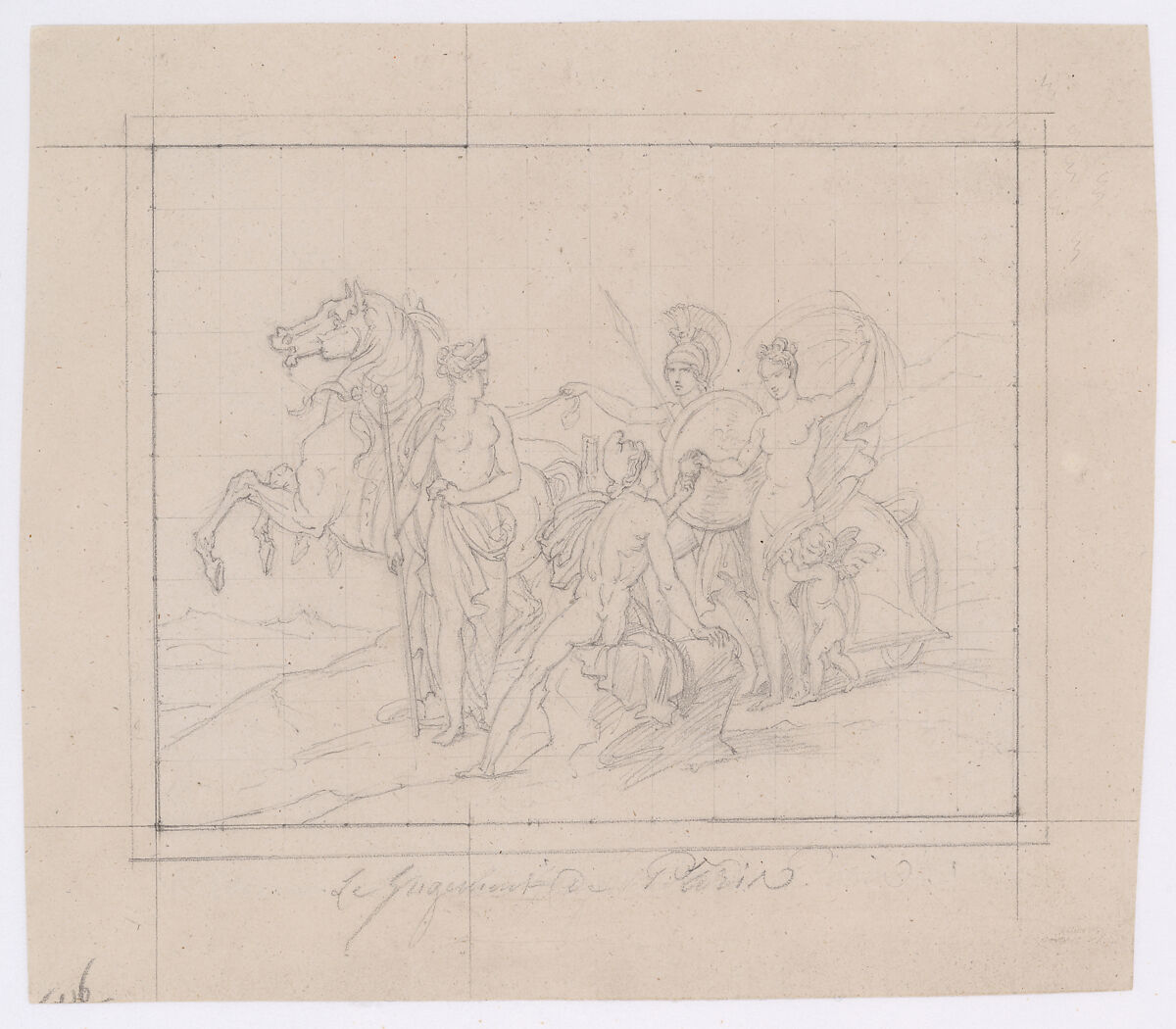 We know from a letter from his friend, the painter Pierre Narcisse Guérin, sent from the Villa Medici in Rome, on August 8, 1804 that Gérard had begun working on a painting depicting The Judgment of Paris, a mythological tale that appears in Homer’s Iliad, in which the Trojan prince Paris judges the beauty of three goddesses, ultimately awarding the golden apple to Venus in return for her gift of Helen of Sparta. Paris’s abduction of the Spartan queen would set off the Trojan War. Gérard became frustrated with his canvas and destroyed it in 1812, salvaging only a few small fragments. This study is a record of Gérard’s composition.