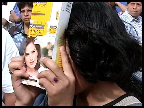 Cinepolis begins like many films these days: with a Coca Cola advertisement and an exploding field of popcorn kernels. Appropriating from the Cinepolis theater chain the familiar intro sequence of a film-strip rollercoaster ride through a cosmic concession stand, Ximena Cuevas then transports viewers to a dystopian present, where the magic of the movies is turned to sinister ends. Cuevas’s apocalypse involves an alien takeover, but the bigger threat is a media blitz; To suppress public panic, the Mexican state wages a campaign of distraction across radio, film, and television. Splicing together commercials, reality shows, and sci-fi films with snippets of cinema verité, Cuevas simulates a wry saturation of corporate imagery. It is no coincidence that most of this material originates outside of Cuevas’s native Mexico—she has lamented that “Mexico’s mass media is full of borrowed images. That borrowing seems to them very professional, so they feel they can belong to the first world and to use ‘American’ images.” So when Cuevas intercuts her apocalyptic scenario with footage of a woman at a drive-through ordering a “Mexican McBreakfast, Mexican McMuffin, and Mexican McBean,” fantasy and fact prove tricky to discern.