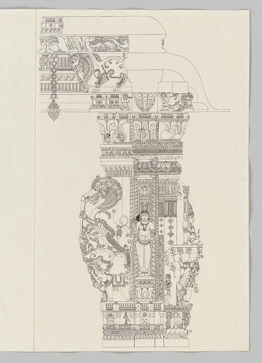These eighteen drawings depict sculptural piers in the Pudu Mandapa (‘New Pillared Hall’), a temple festival hall built around 1630 as an addition to the Minakshi-Sundareshvara temple complex at Madurai. The hall was constructed at the behest of the Nayaka ruler Tirumala Nayak (r. 1623–59), whose reign marked a high point in temple and courtly patronage at the southern city of Madurai. The interior gallery is adorned with 124 elaborately sculpted piers, capitals and lintels decorated with narrative reliefs of the Brahmanical gods and local legends devoted to their worship. These meticulously executed ink drawings are on English laid paper watermarked ‘J. Whatman’ and with the firm’s trademark fleur-de-lis and the year 1798.