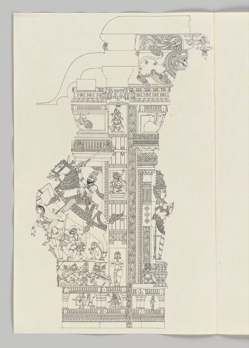 These eighteen drawings depict sculptural piers in the Pudu Mandapa (‘New Pillared Hall’), a temple festival hall built around 1630 as an addition to the Minakshi-Sundareshvara temple complex at Madurai. The hall was constructed at the behest of the Nayaka ruler Tirumala Nayak (r. 1623–59), whose reign marked a high point in temple and courtly patronage at the southern city of Madurai. The interior gallery is adorned with 124 elaborately sculpted piers, capitals and lintels decorated with narrative reliefs of the Brahmanical gods and local legends devoted to their worship. These meticulously executed ink drawings are on English laid paper watermarked ‘J. Whatman’ and with the firm’s trademark fleur-de-lis and the year 1798.