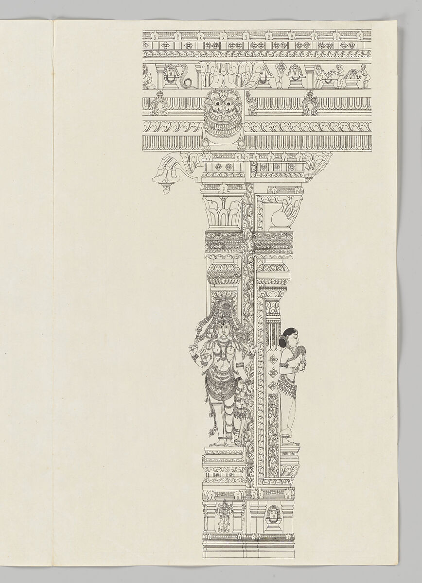 These eighteen drawings depict sculptural piers in the Pudu Mandapa (‘New Pillared Hall’), a temple festival hall built around 1630 as an addition to the Minakshi-Sundareshvara temple complex at Madurai. The hall was constructed at the behest of the Nayaka ruler Tirumala Nayak (r. 1623–59), whose reign marked a high point in temple and courtly patronage at the southern city of Madurai. The interior gallery is adorned with 124 elaborately sculpted piers, capitals and lintels decorated with narrative reliefs of the Brahmanical gods and local legends devoted to their worship. These meticulously executed ink drawings are on English laid paper watermarked ‘J. Whatman’ and with the firm’s trademark fleur-de-lis and the year 1798.