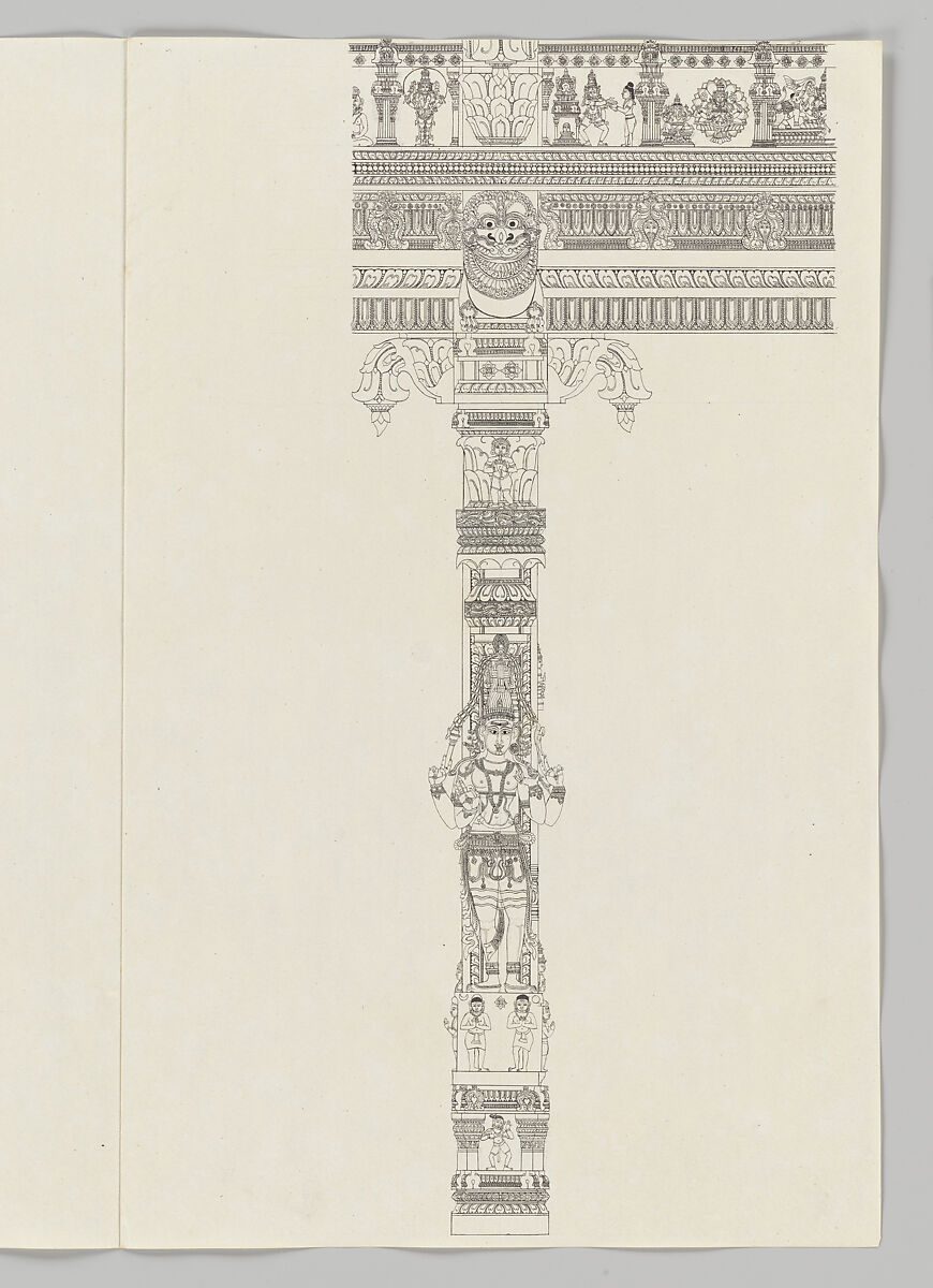 These eighteen drawings depict sculptural piers in the Pudu Mandapa (‘New Pillared Hall’), a temple festival hall built around 1630 as an addition to the Minakshi-Sundareshvara temple complex at Madurai. The hall was constructed at the behest of the Nayaka ruler Tirumala Nayak (r. 1623–59), whose reign marked a high point in temple and courtly patronage at the southern city of Madurai. The interior gallery is adorned with 124 elaborately sculpted piers, capitals and lintels decorated with narrative reliefs of the Brahmanical gods and local legends devoted to their worship. These meticulously executed ink drawings are on English laid paper watermarked ‘J. Whatman’ and with the firm’s trademark fleur-de-lis and the year 1798.