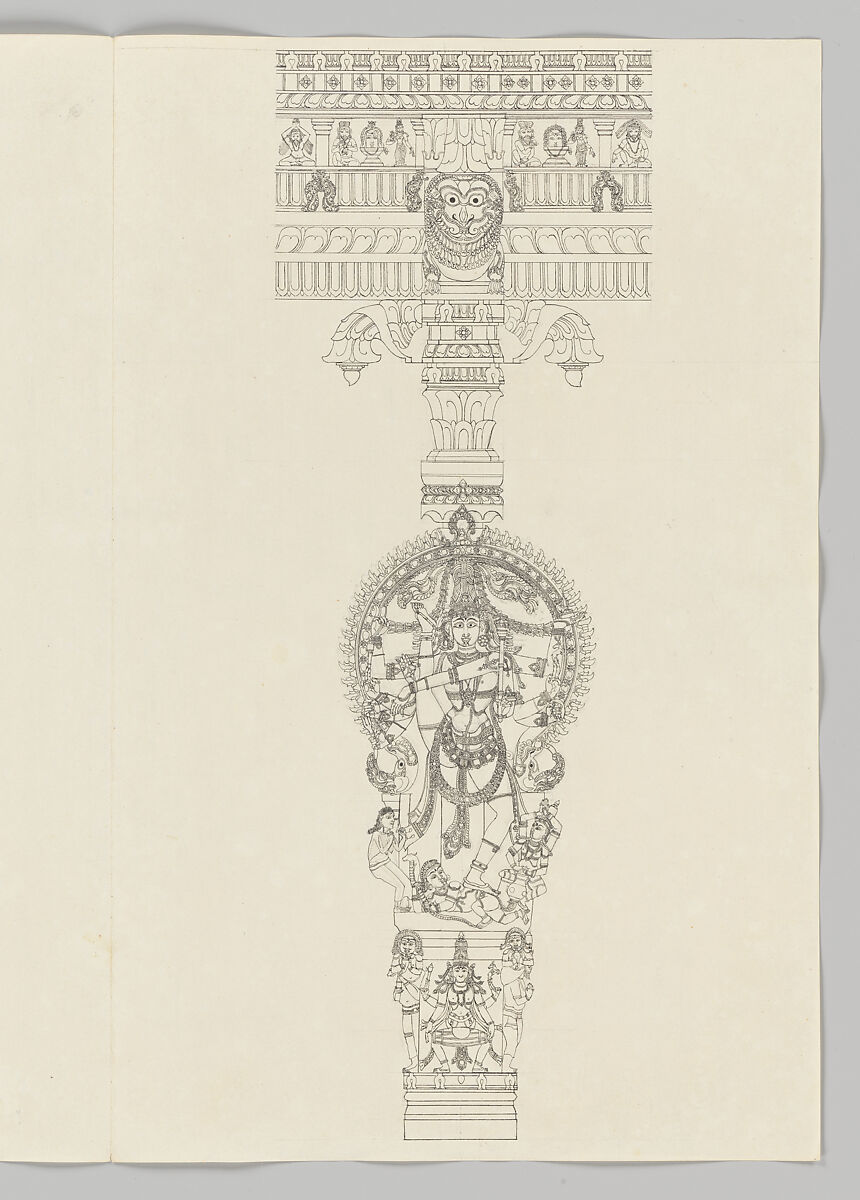 These eighteen drawings depict sculptural piers in the Pudu Mandapa (‘New Pillared Hall’), a temple festival hall built around 1630 as an addition to the Minakshi-Sundareshvara temple complex at Madurai. The hall was constructed at the behest of the Nayaka ruler Tirumala Nayak (r. 1623–59), whose reign marked a high point in temple and courtly patronage at the southern city of Madurai. The interior gallery is adorned with 124 elaborately sculpted piers, capitals and lintels decorated with narrative reliefs of the Brahmanical gods and local legends devoted to their worship. These meticulously executed ink drawings are on English laid paper watermarked ‘J. Whatman’ and with the firm’s trademark fleur-de-lis and the year 1798.