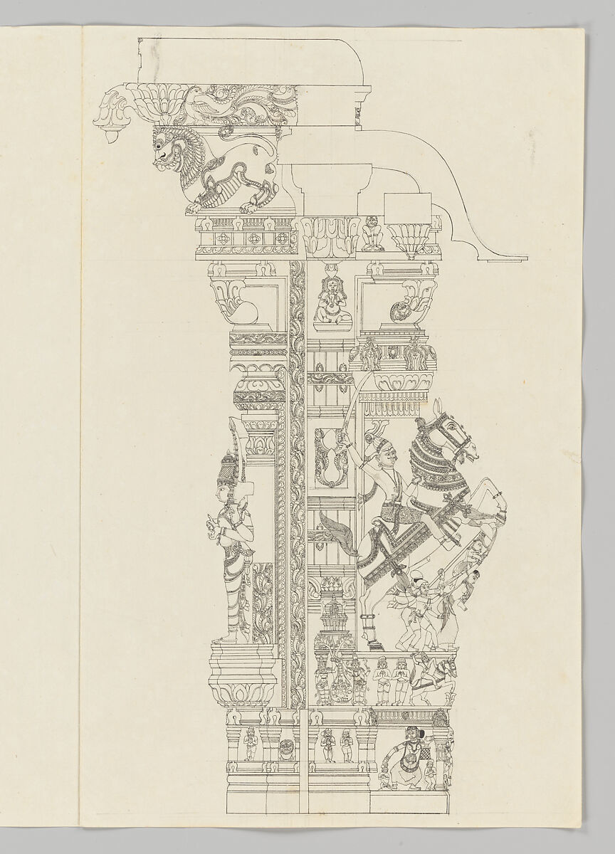 These eighteen drawings depict sculptural piers in the Pudu Mandapa (‘New Pillared Hall’), a temple festival hall built around 1630 as an addition to the Minakshi-Sundareshvara temple complex at Madurai. The hall was constructed at the behest of the Nayaka ruler Tirumala Nayak (r. 1623–59), whose reign marked a high point in temple and courtly patronage at the southern city of Madurai. The interior gallery is adorned with 124 elaborately sculpted piers, capitals and lintels decorated with narrative reliefs of the Brahmanical gods and local legends devoted to their worship. These meticulously executed ink drawings are on English laid paper watermarked ‘J. Whatman’ and with the firm’s trademark fleur-de-lis and the year 1798.