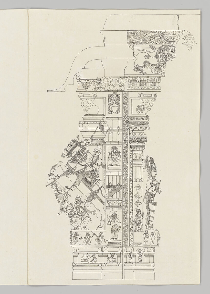 These eighteen drawings depict sculptural piers in the Pudu Mandapa (‘New Pillared Hall’), a temple festival hall built around 1630 as an addition to the Minakshi-Sundareshvara temple complex at Madurai. The hall was constructed at the behest of the Nayaka ruler Tirumala Nayak (r. 1623–59), whose reign marked a high point in temple and courtly patronage at the southern city of Madurai. The interior gallery is adorned with 124 elaborately sculpted piers, capitals and lintels decorated with narrative reliefs of the Brahmanical gods and local legends devoted to their worship. These meticulously executed ink drawings are on English laid paper watermarked ‘J. Whatman’ and with the firm’s trademark fleur-de-lis and the year 1798.