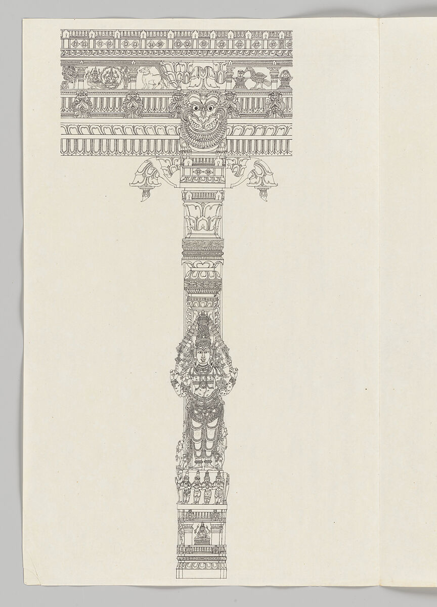 These eighteen drawings depict sculptural piers in the Pudu Mandapa (‘New Pillared Hall’), a temple festival hall built around 1630 as an addition to the Minakshi-Sundareshvara temple complex at Madurai. The hall was constructed at the behest of the Nayaka ruler Tirumala Nayak (r. 1623–59), whose reign marked a high point in temple and courtly patronage at the southern city of Madurai. The interior gallery is adorned with 124 elaborately sculpted piers, capitals and lintels decorated with narrative reliefs of the Brahmanical gods and local legends devoted to their worship. These meticulously executed ink drawings are on English laid paper watermarked ‘J. Whatman’ and with the firm’s trademark fleur-de-lis and the year 1798.