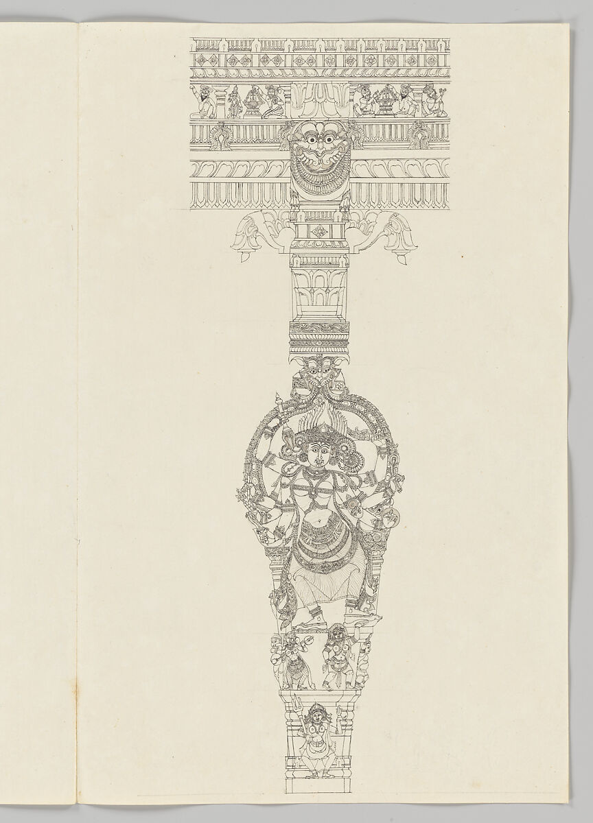 These eighteen drawings depict sculptural piers in the Pudu Mandapa (‘New Pillared Hall’), a temple festival hall built around 1630 as an addition to the Minakshi-Sundareshvara temple complex at Madurai. The hall was constructed at the behest of the Nayaka ruler Tirumala Nayak (r. 1623–59), whose reign marked a high point in temple and courtly patronage at the southern city of Madurai. The interior gallery is adorned with 124 elaborately sculpted piers, capitals and lintels decorated with narrative reliefs of the Brahmanical gods and local legends devoted to their worship. These meticulously executed ink drawings are on English laid paper watermarked ‘J. Whatman’ and with the firm’s trademark fleur-de-lis and the year 1798.