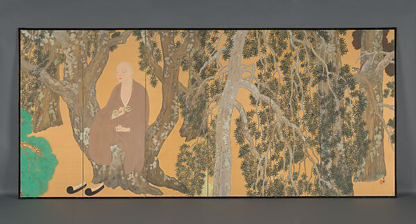 In the serene natural setting of a cypress grove, a Buddhist monk sits cross-legged in meditation in the forking branches of an ancient tree. In his right hand he wields a vajra “thunderbolt,” a ritual implement symbolic of cleaving through ignorance; in his left hand he clasps a string of crystal Buddhist rosary beads. He has left his Chinese-style slippers at the base of the trunk. A squirrel is perched on branch on the far right. Opposite the monk, the sun glistens through another cypress tree, alongside a pine tree from which dangles a yellow-leafed vine, indicating the season is autumn. Another squirrel climbs the tree. Two small birds fly toward the grove; five others are perched in branches. The artist Hashimoto Kansetsu gave this set of six-panel folding screens the evocative title Tranquil Light (Jakkō 寂光). The term Jakkō is derived from the Buddhist term Jō-jakkōdo 常寂光土, or “Pure Land of Serenity,” which according to scriptures is a land “filled with the light of truth.”