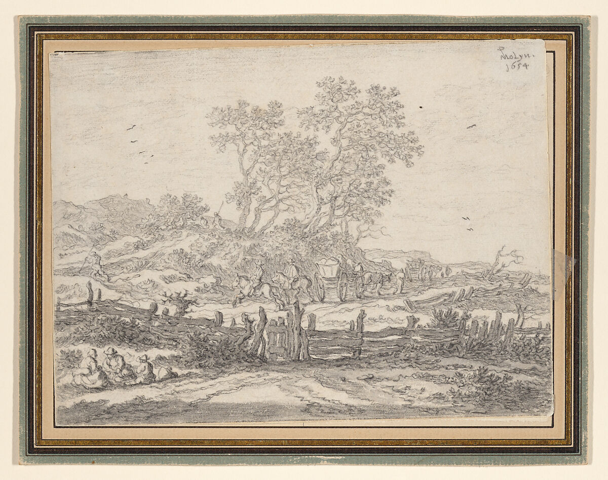 De Molijn made a career of depicting in painting, drawing, and print scenes set in the dunes near Haarlem. This charming sheet belongs to his most creative period between 1654 and 1658, when he made numerous such drawings, usually signed and dated. He also made duplicates of many of them, which suggests that they were popular. The addition of wash to the chalk drawing to indicate dark shadow on the fence and on the ground in the foreground emphasizes the luminosity of the scene taking place in the background on a sunny day on the dunes near the Dutch seashore.